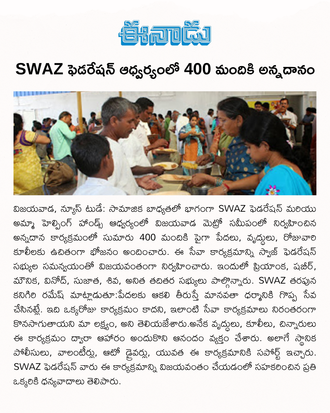 On behalf of SWAZ Federation, food was donated to the poor during Ugadi. Many poor people took food and enjoyed it very much. We sincerely wish that more such programs should be done.